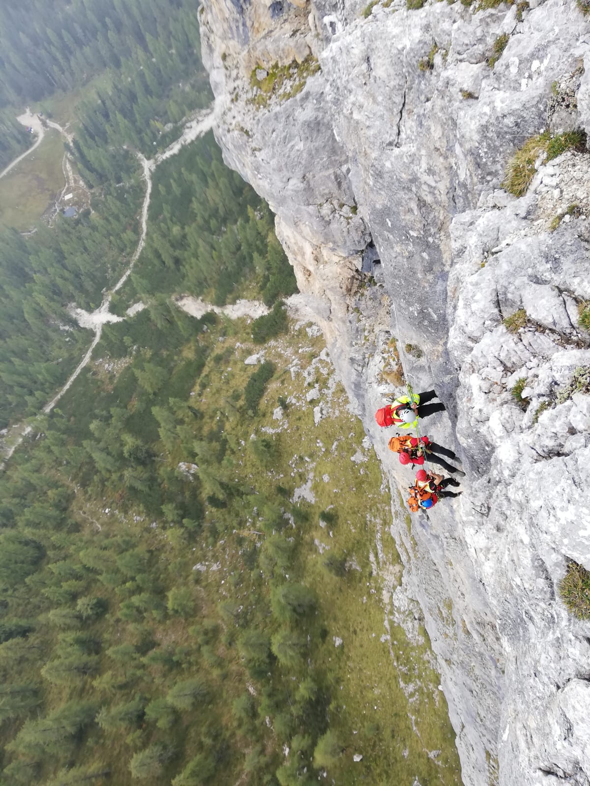 Un secondo gruppo ha invece attrezzato una calata ‘a grappolo’ fino dai due rocciatori incrodati, poi recuperati dall’elicottero del Suem di Pieve di Cadore con un verricello di 70 metri.